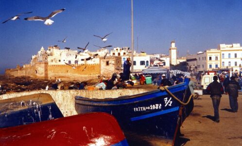 Per Bus gelangte ich „zügig“ zur Fähre, die mich samt imposanter Delphin-Begleitung nach Tanger brachte. Obwohl ich zuvor schon, noch in den Siebzigern, mit Bruder Wolfgang und seiner damaligen Lebensgefährtin Edith, Marokko per mit Steinen beworfenem Auto inspizierte, gelangte ich diesmal gleich in mehrere Touri-Fallen. Nähe Bahnhof beschlossen mir, ein paar halbstarke (mehr halb als starke) Burschen, ob ich wollte oder nicht, die Stadt zu zeigen. Nach heftigem Streit um Bezahlung, kamen (wie durch ein Wunder!) etwas ältere Typen daher, um mich aus dieser Situation zu retten. Sie entpuppten sich als noch viel bedrohlicher und wollten von mir ein Vielfaches für ihre heldenhafte Befreiungsaktion. Es schien mir schon aussichtslos da unbeschadet rauszukommen, als eine nächstgrößere Truppe in Form von Polizisten auftauchte. Kurz dachte ich noch den Irrwitz überstanden zu haben, als mir langsam klar wurde, jetzt endgültig in der Scheiße zu stecken. Die Bullen taten, als fischten sie ein Drogenpackerl aus meinem Rucksack und zwangen mich, ihnen meine komplette Barschaft samt Pass zu übergeben. Sie erpressten mich, denn mir war natürlich klar, dass Aufenthalte in dortigen Häfen nicht begrenzt sind und Folter sowieso an der Tagesordnung ist. Mein Bares war ihnen zu wenig und sie schnappten mich, einer links, einer rechts (hatte da ein grelles Déjà-vu!). Als sie kurz von einer ähnlichen Szenerie abgelenkt wurden, ergriff ich die Chance und lief so schnell und zickzack(!) ich konnte, zum Zug, der sich gerade in Bewegung setzte. Noch nie hatte bis dato jemand nach mir geschossen, ja dies war mein Erstes Mal! Hab jetzt noch das scharfe Knallen der Geschoße auf das Eisen der Bahn im Ohr. Somit verbrachte ich nicht einmal eine Nacht in Tanger. Eines vorweg, ärger wurde es nimmer. Nach 2 Tagen in Marrakesch, das mir damals schon zu sehr Bilderbuch und touristisch vorkam, landete ich in 1000 & 1 Nacht, nämlich in Essaouira, meinem heiß ersehnten Wallfahrtsort, denn hier residierten kurzfristig schon mal, aus welchen Gründen auch immer, Jimi Hendrix, Joni Mitchell und Carlos Santana. Es war wirklich wunderbar und ich Verstand den Mythos als Sehnsuchtsort für Kreative. Weniger kreativ fand ich eine Einladung, die wieder in Erpressung mündete. Ja, zum großen Fischessen am Strand durfte ich mitkommen, von dort aber erst nach Abgabe des Doppelten, das ich in einem Luxusrestaurant bezahlt hätte, wieder verschwinden. Ich ließ die Hälfte dort und rannte wieder mal, was das Zeug hielt, Mahlzeit! Nach recht angenehmen Aufenthalten in Tafrout und Tiznit und in 2 Berberdörfern am Rand des Atlasgebirges wie auch in Sidi Ifni und Mirleft an der Atlantikküste gelangte ich in die Westsahara. Übliche öffentliche Verkehrsmittel gabs dort nicht mehr. Man musste in wechselnden Militär- Jeeps oder Landrovers jeweils 80 bis 100 km mitgenommen werden, was zusehends schwieriger wurde, da bei jedem Stopp oder Fahrzeugwechsel das Gepäck der Insassen auf der Piste unter vorgehaltenen Maschinengewehren entleert und kontrolliert wurde. Da ich einziger Auswärtiger und mit üppigem Gepäck unterwegs war, kostete ich die meiste Zeit und den größten Ärger aller Beteiligten. Deshalb wurde erstmal ein mehrtägiger Zwischenstopp eingelegt und Boujdour, nicht mehr allzu weit von der mauretanischen Grenze entfernt, war der auserwählte Ort. Es gab ein einziges Hotel im Ort, was mir die Qual der Wahl ersparte. Ich wurde der einzige und erlesene Gast, bekam das einzige und unverschließbare fensterlose Zimmer und wurde tatsächlich von der nur geringfügig verschleierten, Tochter oder Schwester (war mir bis zuletzt nicht ganz klar) des geringfügig muslimischen Wirten mehr als nur kulinarisch verwöhnt. Ein großes anderes Privileg wurde mir insofern zuteil, indem ich zum Ehrengast bei einem ganz besonderen Ereignis auserkoren wurde. Boujdour bekam seinen ersten und bis dahin einzigen Fernseher und die Gaststube des Hotels bot den erhabensten Platz hierfür. Mein Wirt lud den gesamten Ort zur Einweihung und machte aus einem unscharfen verwackelten chinesischen Kampfvideo mit arabischen Untertiteln quasi eine Kino-Premiere. Ich bekam einen rosa-überzogenen Großvater- oder Ohrwaschelthron direkt vor und unter dem Fernseher gestellt und durfte oder musste 3 Stunden lang höflichkeitshalber ausharren. Neben und hinter mir gabs nur sowas wie grindige Heurigenbänke, auf denen so ziemlich die gesamte Ortsprominenz Platz nahm und jubelte. Vor dem Eingang bildete sich auch noch eine schier endlose Schlange, die ich durchaus beneidete, da sie weder optisch noch akustisch viel von dem Ereignis mitbekommen konnte. Tage danach war ich über Dakhla bald an der mauretanischen Grenze angelangt, wurde aber trotz einfallsreicher Bestechungsversuche mit der Begründung des Polisariokrieges nicht rüber gelassen. Die für zuletzt geplanten Besuche im Senegal wurden somit, nicht zuletzt auch da mir einfiel, in Wien längst und vielleicht sogar sehnsüchtig erwartet zu werden, vorerst mal auf Eis gelegt, welches aufgrund der afrikanischen Hitze irgendwann auch wieder schmelzen sollte. Ein späterer ausführlicher Marokkobesuch, bei dem die Bullen offenbar dazu abkommandiert waren, den Touristen möglichst keine Unannehmlichkeiten zu bereiten, fiel bedeutend freundlicher und entspannter aus. Und Marta Maranon ist heute Initiatorin und Vorsitzende eines namhaften Hilfsprojektes in Afrika…
