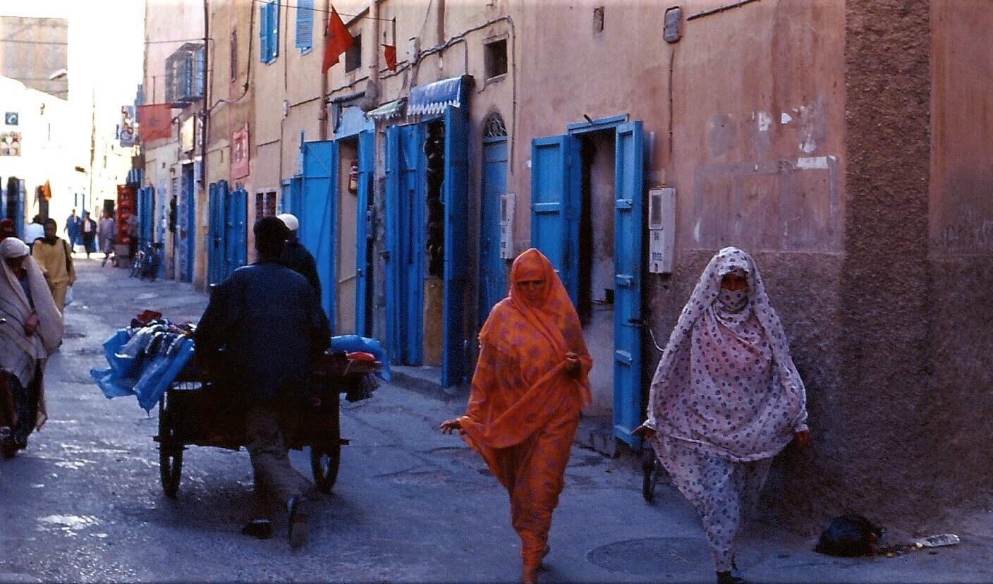 Per Bus gelangte ich „zügig“ zur Fähre, die mich samt imposanter Delphin-Begleitung nach Tanger brachte. Obwohl ich zuvor schon, noch in den Siebzigern, mit Bruder Wolfgang und seiner damaligen Lebensgefährtin Edith, Marokko per mit Steinen beworfenem Auto inspizierte, gelangte ich diesmal gleich in mehrere Touri-Fallen. Nähe Bahnhof beschlossen mir, ein paar halbstarke (mehr halb als starke) Burschen, ob ich wollte oder nicht, die Stadt zu zeigen. Nach heftigem Streit um Bezahlung, kamen (wie durch ein Wunder!) etwas ältere Typen daher, um mich aus dieser Situation zu retten. Sie entpuppten sich als noch viel bedrohlicher und wollten von mir ein Vielfaches für ihre heldenhafte Befreiungsaktion. Es schien mir schon aussichtslos da unbeschadet rauszukommen, als eine nächstgrößere Truppe in Form von Polizisten auftauchte. Kurz dachte ich noch den Irrwitz überstanden zu haben, als mir langsam klar wurde, jetzt endgültig in der Scheiße zu stecken. Die Bullen taten, als fischten sie ein Drogenpackerl aus meinem Rucksack und zwangen mich, ihnen meine komplette Barschaft samt Pass zu übergeben. Sie erpressten mich, denn mir war natürlich klar, dass Aufenthalte in dortigen Häfen nicht begrenzt sind und Folter sowieso an der Tagesordnung ist. Mein Bares war ihnen zu wenig und sie schnappten mich, einer links, einer rechts (hatte da ein grelles Déjà-vu!). Als sie kurz von einer ähnlichen Szenerie abgelenkt wurden, ergriff ich die Chance und lief so schnell und zickzack(!) ich konnte, zum Zug, der sich gerade in Bewegung setzte. Noch nie hatte bis dato jemand nach mir geschossen, ja dies war mein Erstes Mal! Hab jetzt noch das scharfe Knallen der Geschoße auf das Eisen der Bahn im Ohr. Somit verbrachte ich nicht einmal eine Nacht in Tanger. Eines vorweg, ärger wurde es nimmer. Nach 2 Tagen in Marrakesch, das mir damals schon zu sehr Bilderbuch und touristisch vorkam, landete ich in 1000 & 1 Nacht, nämlich in Essaouira, meinem heiß ersehnten Wallfahrtsort, denn hier residierten kurzfristig schon mal, aus welchen Gründen auch immer, Jimi Hendrix, Joni Mitchell und Carlos Santana. Es war wirklich wunderbar und ich Verstand den Mythos als Sehnsuchtsort für Kreative. Weniger kreativ fand ich eine Einladung, die wieder in Erpressung mündete. Ja, zum großen Fischessen am Strand durfte ich mitkommen, von dort aber erst nach Abgabe des Doppelten, das ich in einem Luxusrestaurant bezahlt hätte, wieder verschwinden. Ich ließ die Hälfte dort und rannte wieder mal, was das Zeug hielt, Mahlzeit! Nach recht angenehmen Aufenthalten in Tafrout und Tiznit und in 2 Berberdörfern am Rand des Atlasgebirges wie auch in Sidi Ifni und Mirleft an der Atlantikküste gelangte ich in die Westsahara. Übliche öffentliche Verkehrsmittel gabs dort nicht mehr. Man musste in wechselnden Militär- Jeeps oder Landrovers jeweils 80 bis 100 km mitgenommen werden, was zusehends schwieriger wurde, da bei jedem Stopp oder Fahrzeugwechsel das Gepäck der Insassen auf der Piste unter vorgehaltenen Maschinengewehren entleert und kontrolliert wurde. Da ich einziger Auswärtiger und mit üppigem Gepäck unterwegs war, kostete ich die meiste Zeit und den größten Ärger aller Beteiligten. Deshalb wurde erstmal ein mehrtägiger Zwischenstopp eingelegt und Boujdour, nicht mehr allzu weit von der mauretanischen Grenze entfernt, war der auserwählte Ort. Es gab ein einziges Hotel im Ort, was mir die Qual der Wahl ersparte. Ich wurde der einzige und erlesene Gast, bekam das einzige und unverschließbare fensterlose Zimmer und wurde tatsächlich von der nur geringfügig verschleierten, Tochter oder Schwester (war mir bis zuletzt nicht ganz klar) des geringfügig muslimischen Wirten mehr als nur kulinarisch verwöhnt. Ein großes anderes Privileg wurde mir insofern zuteil, indem ich zum Ehrengast bei einem ganz besonderen Ereignis auserkoren wurde. Boujdour bekam seinen ersten und bis dahin einzigen Fernseher und die Gaststube des Hotels bot den erhabensten Platz hierfür. Mein Wirt lud den gesamten Ort zur Einweihung und machte aus einem unscharfen verwackelten chinesischen Kampfvideo mit arabischen Untertiteln quasi eine Kino-Premiere. Ich bekam einen rosa-überzogenen Großvater- oder Ohrwaschelthron direkt vor und unter dem Fernseher gestellt und durfte oder musste 3 Stunden lang höflichkeitshalber ausharren. Neben und hinter mir gabs nur sowas wie grindige Heurigenbänke, auf denen so ziemlich die gesamte Ortsprominenz Platz nahm und jubelte. Vor dem Eingang bildete sich auch noch eine schier endlose Schlange, die ich durchaus beneidete, da sie weder optisch noch akustisch viel von dem Ereignis mitbekommen konnte. Tage danach war ich über Dakhla bald an der mauretanischen Grenze angelangt, wurde aber trotz einfallsreicher Bestechungsversuche mit der Begründung des Polisariokrieges nicht rüber gelassen. Die für zuletzt geplanten Besuche im Senegal wurden somit, nicht zuletzt auch da mir einfiel, in Wien längst und vielleicht sogar sehnsüchtig erwartet zu werden, vorerst mal auf Eis gelegt, welches aufgrund der afrikanischen Hitze irgendwann auch wieder schmelzen sollte. Ein späterer ausführlicher Marokkobesuch, bei dem die Bullen offenbar dazu abkommandiert waren, den Touristen möglichst keine Unannehmlichkeiten zu bereiten, fiel bedeutend freundlicher und entspannter aus. Und Marta Maranon ist heute Initiatorin und Vorsitzende eines namhaften Hilfsprojektes in Afrika…