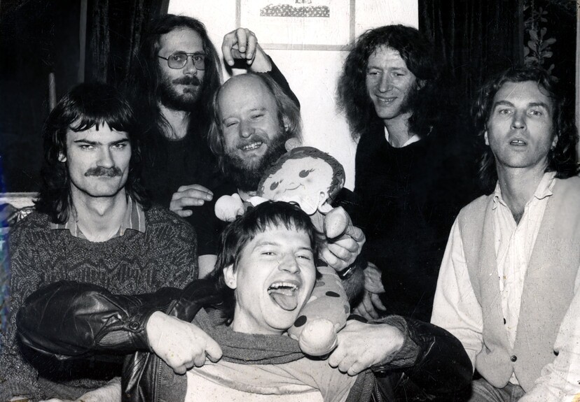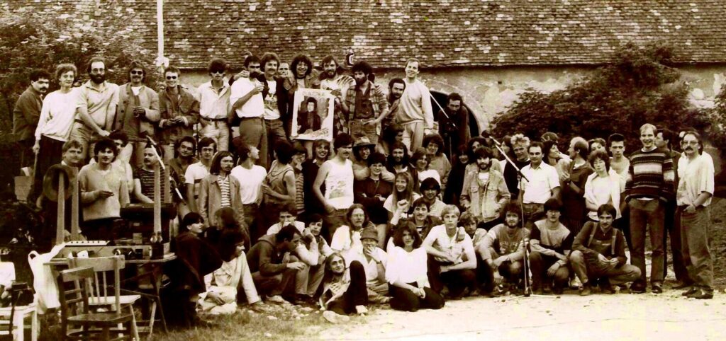 Ich kümmerte mich um Nachschub, nicht nur was Bier- u. Weinvorräte anbelangt, sondern auch den Nachwuchs an leiwanden Leuten vorwiegend aus der Wienerstadt. Martin R, ein solcher, wie auch Monika D, oder Ophelia, wie ich sie nannte und mit der ich noch viel interessanteres teilte, begleiteten mich leidenschaftlich zu allen möglichen Jazz-, Folk- u. ähnlichen Konzerten, wo wir gute Kontakte ergatterten, um bald schon mit ersten derartigen Gigs im oder vor dem Schloss aufwarten zu können. Mit der unprofessionellen aber durchaus sympathischen Werbung hierfür, kamen neue gute Leute raus & ein paar davon, wie eine Wiener Motorradgang, featuring Kurti V, der bald auch als erfolgreicher Gitarrist bei österreichischen Reggae-Bands fremdging, sein Bruder Ernsti, Hömal „Guzzi“ W, legendärer Klobesendesigner und späterer Teilzeitwinzer & Oberkellner und DJ Peterl W blieben. Wie auch Pezi U, mit dem ich heuer, also über 40 Jahre danach, hoffentlich noch samt seiner neu erworbenen 900er Tiger ausfahren werde, sein musizierender Cousin Jimmy und dessen Kompagnon Udo, die irgendwann auch unseren baldigen Karriereleiterreiter und späteren Concertologen Heinz „Hasi“ S einschleusten. Arzt-Lehrling (so ana kau nie schodn!) Otti B aus Laa und ein rauchfangkehrender „wilder“ Michl aus Fünfhaus machten das Kraut endgültig fett. Oder nein, das war dann doch ein äußerst kreatives Mädchenquintett mit Britta, Ute, Barbara, Claudia, Bettina und Maria aus dem nahen Mistelbach.