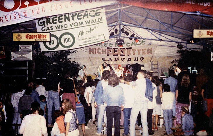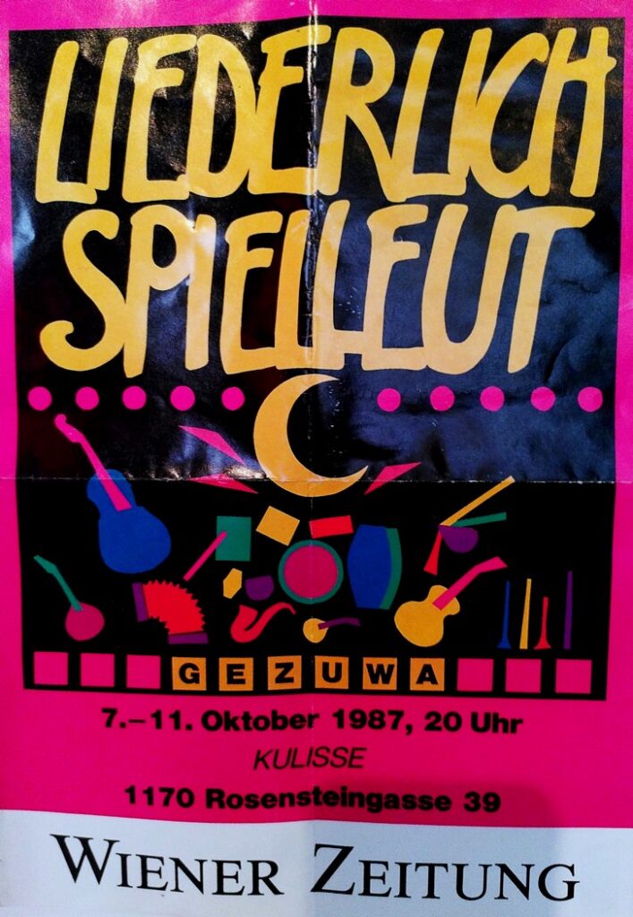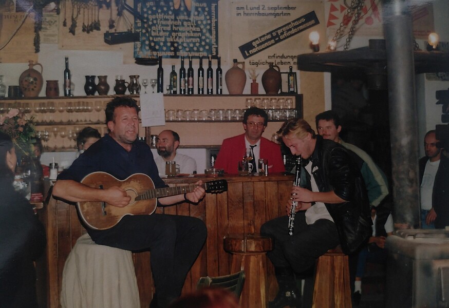 Künstler (sind mir jetzt sicher nicht alle eingefallen!) wie Hamish Imlach, Allen Taylor, Phil Shackleton, Cindy Peress, der Cousin David Bowie’s Gypsy Dave Smith, H.C.Artmann, Erwin Steinhauer, Martin Auer, Den Warrick, Tom Telepak & Luke Tobin, Willi Resetarits „mit“ Ostbahnkurti samt Chefpartie, Wilfried, Sigi Maron, Heli Deinboek, Mo & seine Gangsters In Love, Boris Bukowsky, Hans Thessink, die Untouchables, die Mugl-Company, Jazzgitti mit ihren Discokillers, Ostinato, Rens Newland Trio, Fritz Seiner Quartett, Salah Addin, Dele’s Reggae/Roots-Music, Taru Africa und mehrere andere afrikanische u. Latin-Bands. Harry Stoika, Peter Legat’s Incognito aus denen später Count Basic hervorgingen, sowie die Hallucination Company noch in Niederleis, die Kärntner Bluesbreakers, Zappa‘s Bluespumpm und die Mojo Blues-Band, Peter Ratzenbeck, Ripoff Raskolnikov, das Delos Klassik-Trio, Christina Zurbrügg, Adula Ibn Quadr, Lakis & Achwach, Michael Kampelmühler, Stadtpfeiffer, Merlin, Saitensprung, die Vienna Ceilidh-Band, unsere fast schon Hausband Liederlich Spielleut, Carlos Berger, Peter Del Bello, Opi & The Röhrljeans, Square Leaves, Gerry Schuller, Graymalkin, Deschowieda und letztlich die Tschuschenkapelle wie auch das Kollegium Kalksburg und(!) die örtliche Blasmusikkapelle, die mal gegen Morgengrauen gemeinsam mit unserem Karli Ratzer aufgeigten ..oder eher „überbliesen“, blieben mir treue Weggefährten.