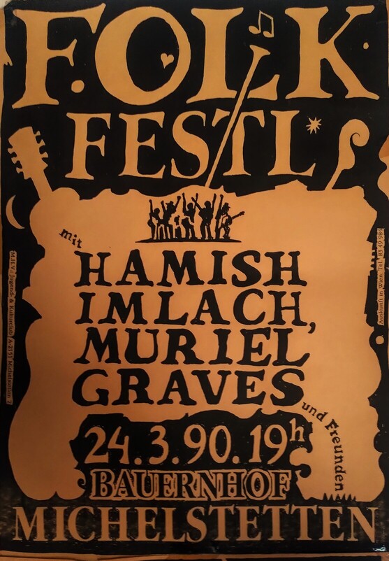 Wilfried R, Kurzzeitkeyboarder unserer Hausband und mit seiner Freundin Ulli späterer Erfinder von „Wir Sind Kaiser“, animierte mich zunehmend fremd zu gehen. Nach gut 10 Jahren selbstverschuldeten Kulturbetriebes im Herzen des Weinviertels, musste ich doch wohl fremd gehen und mit den Jazz-Festivals von Wiesen & Saalfelden gelang das auch. Entsprechende und ähnliche Veranstaltungen in Laa an der Thaya und Mistelbach, wo die Kultodrom-Leute wirklich gutes Programm auf die Beine stellten, wie auch jene des Waldviertels ala Waidhofen und Gutenbrunn, die mir ihre Lokalmatadore Bluespumpm auch persönlich näherbrachten, trugen das ihre dazu bei. Zappa C, der Sänger und Gitarrist und seine Erika, luden Wilfried und mich des Öfteren auf ihren Hof bei Heidenreichstein, wo wir bis weit nach Mitternacht freudig das übliche taten. Nur war halt auch vor 6 in der Früh schon Tagwache! Es musste gemolken, gefüttert und ausgemistet werden. Ich entschied mich freiwillig für letzteres. Oh doch, es war leiwand, aber Waldviertler wurde ich dann doch nicht! Ist ja auch zu kalt dort, oder!? Stattdessen machte ich bald immer öfter auf Teilzeitmistelbacher und dank „meinem“ Wirten Reinhard Kruspel und seinem damals ins Leben gerufenen Alten Depot konnte ich dem Kulturbetrieb auf sehr abwechslungsreiche Weise treu bleiben. Mille Grazie, lieber Padrone! Mit Hamish Imlach, dem „Biggest Man In Scottish Folkmusic“, der einst mit John Martin jammte, verband mich auch danach noch eine besondere Freundschaft. Er besuchte mich mehrmals mit seiner ebenso singenden Frau Muriel Graves und oft auch mit dem einst mit Van Morrison in „Them“ spielenden Iren Den Warrick in Wien, wo es Gigs bei All-Star-Festivals oder im Metropol wie auch in der Kulisse gab. Wir fuhren gemeinsam mit Den‘s u. auch meiner Freundin ins mir vertraute Weinviertel, suchten ein gemütliches kleines Häuschen in der Nähe von Wirt oder Heurigen für meine Freunde und einen möglichst windschiefen Turm, wie den des „Lupo“ oder wie den Farol von Tavira, für uns. Wir fanden weder noch, aber die stetige Suche, bei der wir auch das fruchtbare Oberschoderlee (mrhban Aladin!) kennenlernten, machte uns allen unheimlichen Spaß. Als denkbar besten Ersatz fanden wir Friedl Umschaid‘s Presshausheurigen, wo wir bis zum Morgengrauen Sessions spielten, kurz bevor man dort Nonsens zu erfinden begann. Natürlich musste ich dieses „varuckte“ Dorf auch H.C.Artmann zeigen, der bei Wohlgefallen an dortigen Weinen, nicht nur aus seiner „Schwoazn Tintn“ las. Und Hamish? Wie mir Muriel nur wenige Jahre später erzählte, beschloss er den Jahreswechsel mit ihr, mit guten Getränken und mit John Lennon zu verbringen. Um Mitternacht prositete er zu letzterem, der mittels Fernseher, quasi aus dem Jenseits strahlte, schlief zufrieden lächelnd ein und wachte nicht mehr auf…