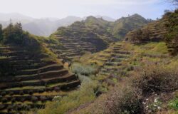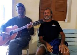 Kurz bevor ich mich jetzt wieder ans Schreiben machte, las ich in der Zeitung von schweren Unwettern und Verwüstungen auf den westlichen Kapverdischen Inseln. Schon länger und immer öfter betreffen die Auswirkungen des Klimawandels vorwiegend die allerärmsten und entlegenen Länder, die nur wenig zum CO2-Ausstoß und zur Erderwärmung beitragen. Aber keine Sorge, früher oder später werden auch Amis, Chinesen, die Inder und wir die Zeche zahlen. „Alien“ Musk & „Amazon“ Bezos samt ihren verbrecherischen Unternehmungen verursachen mehr Dreck als ganze Länder der 3. Welt! Für die westlich von Senegal im Atlantik liegenden Kapverden ist derartiges Szenario auch relativ neu. Ich war bislang 3-mal dort und möchte trotz deutlichen Zurückfahrens der Fliegerei gern wieder hin, denn trotz oftmaligen Leugnens eines Heimatgefühls, dort spür ich derartiges schon ganz gut. Unterschiedlichste Inseln zwischen Ost und West, mit bizarren bergigen Felsenpyramiden einerseits und sandigen karibisch anmutenden Traumstränden andererseits. Und überall die denkbar nettesten und freundlichsten Menschen, meist Nachfahren entflohener Sklaven. Bis Mitte der 70er-Jahre waren die Inseln portugiesische Kolonie, daraus resultiert nicht nur die Amtssprache, sondern auch der melodische Einfluss in der ganz speziellen Musik, die natürlich rhythmisch westafrikanisch geprägt ist, manchmal aber schon fast nach Brasilien klingt, ähnlich wie es die geografische Lage vorgibt. Auf Sao Tiago lernten wir einen umtriebigen Perkussionisten namens Abelardo kennen, mit dem wir nicht nur trommeln durften, er durchwanderte mit uns auch die schönsten, entlegensten und abenteuerlichsten Flecken der Insel. Einmal nahm er mich zum Ertauchen von Oktopussen und Riesenlangusten mit. Während ich an der Oberfläche herumgurkte und es nicht nach unten schaffte, war er schon gute 8 bis 9 Meter tiefer bei den Meeresfrüchten. Da ich dachte, länger unter Wasser sein zu müssen, nahm ich zu viel Luft mit und war dadurch zu aufgeblasen, um runterstrampeln zu können. Auch ohne Luft tat ich mir schwer, so nahm ich mir, nach Abelardo‘s Rat, einen schweren Stein mit, den ich allerdings nach ungefähr 3 Metern fallen ließ, da mir dieser „Abstieg“ dann doch zu schnell vorkam. Während ich wie ein Pfeil wieder nach oben schoss, verfehlte der Stein meinen Freund und seine Viecher nur knapp. 20 Jahre später sollte Abelardo doppelt so breit und schwer sein und als sowas wie ein Ortsvorsteher unschön autoritär und rigid mit seinen Leuten umgehen. Ich verzichtete auf einen Besuch bei diesem Besuch. Damals war erstmals Katharina an Board und erstmals „erforschten“ wir die zu Unrecht kaum heimgesuchte Sao Nikolaou -Insel, die sich für uns fast schon als „Best Of“ präsentierte. Da ich den dortigen Aufenthalt nur knapp überlebte, allerdings auch als das Gegenteil, natürlich aus eigenem Verschulden und einer peinlichen Naivität wegen. An einer spektakulär schönen Felsformation an der Südwestküste, wohin wir nur umständlich per angehaltenen LKW gelangten, befanden sich auf unterschiedlich hohen Ebenen Becken, die immer wieder durch die hohe Brandung befüllt oder bespült wurden. Ich beobachtete dies gute 20 Minuten lang, bis ich in das größte derartige Becken hüpfte. Es dauerte nicht lange, bis sich Katharina die Kehle aus dem Mund schrie und ich eine riesige Wasserwand auf mich zukommen sah. In totaler Schockstarre, wie ein Kaninchen vor der Schlange, verharrte ich, anstatt zu letzterer hochzuklettern, was sich da durchaus noch ausgegangen wäre. Die Monsterwelle katapultierte mich rücklings 6 bis 7 Meter am Fels entlang landeinwärts, bis fast meine komplette Heckansicht aufgeschlitzt war. Wie durch ein Wunder konnte ich mich gerade noch aufrappeln und zu Kathi hochkriechen, ehe der nächste Reserve-Tsunami hereinbrach. Sie griff sich all unser beider Gewand, um mich zu verbinden und halbwegs dicht zu bekommen. So rasch es ging bewegten wir uns zur Straße hoch und hielten das erste Fahrzeug auf, um in die nächste Stadt zu gelangen. Das war ein Schulbus und die anschwellende Blutlache unter mir verängstigte die anwesenden Schüler zutiefst. In einer Sanitätsstation wurde ich sofort und tadellos verarztet, „verflixt“ und zugenäht, bekam einen detaillierten Brief mit, damit mich Krankenhäuser anderer Orte und Inseln effizient servicieren konnten und durfte vorerst länger nicht ins Meer, wenn es sich auch noch so ruhig und harmlos gebärdeten sollte. Tage später in Ribera Grande auf der neben Fogo gebirgigsten Insel Santo Antao kehrten wir, ich noch mit umfangreichem Verband, in ein belebtes und offenbar beliebtes Lokal ein, dessen Ghetto-Blaster unheimlich leiwande Musik von sich gab. Als so etwas wie afrikanische Dire Straits hätte ich’s gesehen …oder gehört und ich fragte den Wirten danach, der ganz stolz erwiderte „it’s my brother and his band!“ und als eine halbe Stunde später die Tür aufging, ergänzte er noch „hey man, here comes Julio, my brother!!“. Natürlich belästigte ich diesen und schmierte ihm, ob seiner fantastischen rauchigen Stimme, jede Menge Honig ums Maul. Ein anwesender örtlicher Gitarrist ließ mich nach meinen großspurigen und nicht mehr ganz so nüchternen Ansagen sein Instrument würgen und siehe da, Julio gesellte sich mit seiner unglaublichen Stimme zu mir. Ich versuchte typisch kapverdischen Grooves und mollige Akkorde, über die er improvisierte, ehe wir bei einer extended version von „Stir It Up“ landeten. Wir luden sich noch gegenseitig ein und schmiedeten Pläne, uns wechselweise zu besuchen, um zu musizieren. Naja, bis jetzt fand, bis auf recht fröhlicher Korrespondenz mittels Katharina, nichts dergleichen noch statt. Na schau ma moi, daunn seh ma eh. Bei meiner bislang letzten Reise auf die Kapverden besuchte ich erstmals auch Fogo mit seinem (oder ihrem) mächtigen gleichnamigen Vulkan und hervorragendem Wein an seinen Hängen und Boavista