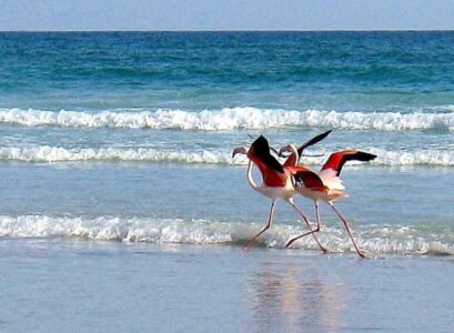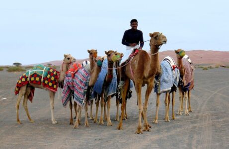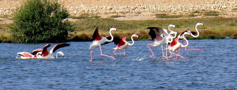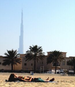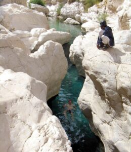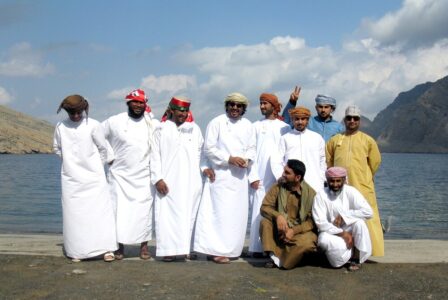 Dieses Dubai hatte mit seiner Altstadt, dem Creek, den Souks und seinen Bewohnern sehr wohl auch die sympathische Seite, was ich von gottspielenden Scheichs mit ihren futuristischen Irrsinnigkeiten nicht behaupten kann. „Sheiks walkin‘ around like kings, wearing fancy jewels and nose-rings“ Dank unserer Abhängigkeit und Hörigkeit von Öl und Treibstoffen geben sich viele als Sklavenhalter und die so gehaltenen, meist aus Süd- oder Südostasien stämmigen sind unterwürfig dankbar für irgendwelche halbwegs regelmäßige Einkünfte und stützen somit zusätzlich das System. Den Burj Kalifa, das mit fast 830 m welthöchste Gebäude, musste ich schon inspizieren, hatte ich doch als Kindergarten-Architekt einst meinen Lego-Turm bis zum Plafond hochgezogen. Nicht ohne hysterisch loszuheulen, als ich erstens damit oben anstand und zweitens die etwas beleibtere Tante, mich ob meiner maßlosen Verwendung aller Steine des Gartens tadelnd, sich plumpen Schrittes näherte und mein Werk zum Einsturz brachte. Unser Verweilen in diesem Emirat hielt sich jedenfalls in Grenzen. Wir steuerten die Halbinsel Musandam mit seinen imposanten Fjorden an, durchschipperten diese natürlich und schlugen in einem jugendherbergsähnlichen und erschwinglichen Matratzenlager auf, mit Blick Richtung nahem Iran und der dazwischen liegenden Straße von Hormuz. Städte wie Muskat, Sur, Nazwa und Salalah gefielen uns wirklich sehr, wie auch die imposanten Lehm-Dörfer und Burgen. Und überall wurden unsere Mädels, Waltraud und Astrid, wertschätzend und mit Respekt behandelt. „Plansee-Bader“ Klaus und ich hatten mehr mit dem erwarteten Problem der Bierlosigkeit zu kämpfen. Als uns der Entzug zu sehr plagte, enterten wir ein Nobelhotel, das wir üblicherweise großräumig umschiffen würden, um für teures Geld warmes Dosenbier zu ergattern. Auch wenn uns die verwendeten Fruchtaromen gewöhnungsbedürftig erschienen, pflegten wir zusehends das Rauchen der Wasserpfeife (Shisha), welches sich sehr gemütlich und kommunikativ mit netten Einheimischen tun ließ. Beeindruckend war natürlich das Erklimmen der beiden Sandwüsten, der Berge und Canyons und die wahrlich paradiesischen Wadis, die wir auch (hier leider nicht nackt!) durchschwimmen konnten. Steilküstenfischer versuchten uns wenig erfolgreich ihr Handwerk beizubringen. Spektakulär war’s allemal. Nähe jemenitischer Grenze fanden wir an einem der schönsten Strände der Welt eine größere Flamingo-Population und gar nicht so scheue wild lebende Kamele. Dort gibt’s auch Weihrauch-Stauden so weit das Auge reicht, also machten wir Bekanntschaft mit unterschiedlichsten daraus gewonnenen Produkten und ich erinnerte mich, als einstiger Ministrant leidenschaftlich und äußerst verschwenderisch damit herumgeräuchert zu haben…