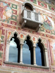 Unsere Mistelbacher „obergrüne“ Martina P wiederum war es, die einige von uns zum Folkfest ins friaulische Spilimbergo lockte. Am dortigen „Campo Sportivo“ konnten wir annähernd gratis unsere Zelte aufschlagen, hatten nicht weit in die malerische Stadtkulisse samt beeindruckender Mosaikschule, wo an mehreren attraktiven Plätzen wie auch auf einer großen Bühne feurige Musik bei meist ebensolcher Kulinarik dargeboten wurde. Der wunderbare türkisgrüne (aber nicht viel wärmere, als die deutsche Saale) Tagliamento war nur eine Fahrradtour entfernt und bot mit seiner anspruchsvollen Strömung und unseren daraus resultierenden Driftorgien ein wunderbar erfrischendes Vorprogramm zur abendlichen Kultur. Mehrmals war da auch mein gelber „Dolphin“, ein gut 40-jähriges Semperit-Kajak dabei und als mich mal die gerade erst kennengelernte Katharina begleitete, warb ich bei ihr darum, eine größere Etappe mit mir flussabwärts zu paddeln. Großspurig erzählte ich, trotz heftigen und stürmischen Seegangs im offenen Meer, noch nie gekentert zu sein und sie willigte natürlich ein. Nach nur ein paar hundert Metern, als wir in einen anderen und größeren Mäander gelangten, scheiterten wir schon kläglichst. Insgesamt kenterten und überwuzzelten wir 3 Mal bis wir endlich an die Höhe von Spilimbergo gelangten, wo wir einigermaßen erschöpft in Badehose und Bikini die erste zur Verfügung stehende Bar aufsuchten und 2 doppelte Grappae erschnorrten. Trotz dieser Peinlichkeiten blieb mir Katharina wie durch ein Wunder wohl gesonnen und erhalten. Ich litt weit mehr als sie beim verzweifeltn Grübeln nach der möglichen Ursache. Ich Depp hatte mich beim Eindringen in den schnelleren Flußabschnitt wie am Motorrad in die Kurve reingelegt, wodurch nur etwas Druck des „anderen“ Wassers reichte, um uns zu kippen. Genau das Gegenteil wäre, wie durchaus öfter in meinem lustigen Leben, g’scheiter g’wesn…