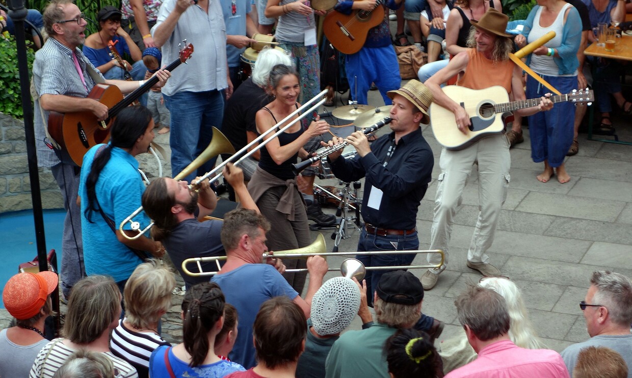 Musikfeste waren immer schon und vermehrt nach meinem eigenen diesbezüglichen Engagement begehrtes Ziel innerhalb unserer Cliquen. Erst regelmäßige Besuche bei Jazz in Wiesen und Folk in Waidhofen, dann nach Roskilde, Montreux, Belfort und ähnlichen internationalen Events, mauserten sich 2 europäische Festivals zur alljährlichen Konstanten heraus. Kultodromler Othmar B versammelte eine Schar neu- und musikgieriger Weinviertler, der ich auch zeitweilig angehören durfte, um nach Rudolstadt im ostdeutschen Thüringen zu einem der umfangreichsten Weltmusikfestivals zu pilgern. Der Ort selbst war schon sehr schön mit seiner Fachwerksarchitektur am Fuße eines mächtigen Schlosses, für den Weg dorthin nahmen wir uns meist auch noch ein paar Tage Zeit, fuhren über Tschechien, Dresden und Erzgebirge rauf und über Bayern wie Bamberg oder Regensburg wieder retour. Ich nächtigte meist im Auto oder am örtlichen Campingplatz. Schlafen war da halt nicht so sehr angesagt, weil nach offiziellem Programm dort noch bis zum Morgengrauen irische Reels gegeigt wurden, ehe quasi zum Frühschoppen schon ab 8 die westafrikanischen Djembetrommler loslegten. Egal, der vorhandene saukalte Pool oder die benachbarte Saale ließ mich meist ganz gut oder halbwegs frisch in den vielseitigen Tag starten.