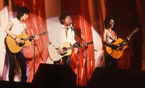 3 Jahre später war’s dann so weit! In der Münchner Olympiahalle wurde ich schließlich „entjungfert“. Mein Freund, Radiomoderator und Ö1-Kulturjournalist Hansi Langsteiner besorgte die Tickets und nahm mich mit in die Bayrische Kapitale, wo wir mehrere interessante Figuren der einschlägigen Szene kennenlernten, die dann bald auch schon unsere Festivals auf Schloss Niederleis beglückten. Seither kam Dylan halbwegs regelmäßig nach Wien. 1984 nebst J. Baez und Santana, der ihm nach seinem eigenen Gig, für ein paar Nummern mit seinem unvergleichlichen Stromruder zur Seite stand. Sein „USA for Africa“-Beitrag fällt eher unter Peinlichkeiten. Als eigentlicher Topact sollte er ohne viel Aufwand die Umbaupause für das finale All-Star-Aufgebot bespielen. Er kam mit seiner Wandergitarre auf die einsame Bühne und sagte seine Begleitmusikanten an „Keith Richards and Ronnie Wood! …I don‘t know, where they are!??” fügte er nach einer endlos langen Minute noch hinzu, ehe die beiden zugedröhnt, wovon auch immer, mit ähnlichen Gitarren und ihrem „Tschick“ im Mund dazustießen. Entweder gab’s keine Monitore, oder sie funkten nicht. Als der Alte, der damals 20 Jahre jünger als ich heute war, seine Kompagnons abwechselnd um Solis bat, spielten die Wolken blasend weiter ihr Schrumm-Schrumm. Erst nachdem ihm eine Saite riss, beendeten auch sie, tief im Glauben, die Nummer sei fertiggezupft, abrupt ihren Einsatz. Mir blieb der Spaß vorerst erspart, da ich da noch mit Helene und Hannibal in Kleinasien weilte und wir die Nacht (ca. 4 Uhr früh Ortszeit) nicht vor einer Glotze verbringen wollten. Meine Mutter allerdings tat dies, nur um ihrem Buben, den sie da schon länger nicht mehr gesehen hatte, auf diese Weise etwas näher zu sein. Sie fand’s natürlich schräg und befremdlich was sie da sah, aber das war für sie damals ohnehin bei fast allem so, was mich betraf. Wenngleich sie schon zuvor mal für eines unserer Dylanfeste in Michelstetten die Birthday-Torte buk, was via Ö3 sogar großflächiger wahrgenommen wurde. Angelika Lang, immer noch die(!) Stimme des ORF, besuchte uns da im Auftrag der „Musicbox“, um über‘s Mikrofon unsere Beweggründe dafür zu erfragen, Stimmungen einzufangen und die zuvor gekostete Torte zu loben.