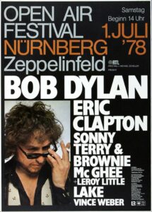 Und dann endlich in 1978*, wir mussten in der 7ten Klasse gewesen sein, beschlossen Christoph und ich, mitsamt 2 anderen (später, aber doch) infizierten Schulkollegen, die für uns erste Chance, den Alten in Europa live zu sehen, zu ergreifen. Da wir alle kaum mit Taschengeld versorgt gewesen waren, wollten wir erst mal per Anhalter zum nächstgelegenen Ort, der bespielt wurde, nämlich dem historisch belasteten Nürnberger Zeppelinfeld, gelangen. Wir 4 langzotteligen Halbstarken hatten es aber nicht einmal g’scheid aus Wien raus geschafft, somit schlug unser Ältester, schon 18-jähriger und „Führer“schein Inhabender vor, den damals wirklich noch tschechischen und heckmotorisierten Skoda seines Vaters zu entwenden. Die Zeit wurde immer knapper und wir jagten diesen Untersatz über die (von wem wohl initiierte?) Westautobahn, bis schon in Grenznähe der quasi im Kofferraum befindliche, nur mäßig gekühlte Motor heiß lief und wir laut Empfehlung, zwecks Abkühlung, auf Raten bis in eine Werkstatt nähe Braunau(!) kamen …und dortblieben! Am Tag nach dem versäumten Open Air Festival mit Dylan, der dort vor Zig-Tausenden in die andere, total entgegengesetzte Richtung als jene, in die zuvor Adolf Hilter runterbellte, „Masters Of War“ sang, mit Sonny Terry, Brownie McGhee und mit Eric Clapton im Vorprogramm, der den Alten letztendlich noch bei „The Times They Are A Changin‘“ begleitete, begaben wir uns per notdürftig geflicktem Tschechenbomber wieder nach Wien. Wenigstens bekam der auf Reha (oder Entzug) befindliche Vater unseres Ältesten nichts davon mit, unsere zum Teil unlustigen Lehrer sehr wohl!