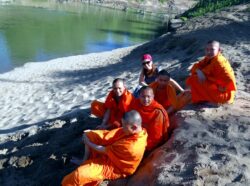 Schon bevor wir uns kennenlernten, plante Katharina ihre längere Reise (und nicht nur zufällig) in dieses Land des Lächelns. Also musste ich natürlich mit, eh klar! Nur konnte ich nicht so lange wie sie „Selbständige“ Urlaub oder frei bekommen, also begann sie ihre Tour erstmal ohne mich in Laos und im thailändischen Norden. Sie schipperte mehrtägig am Mekong, den wir gemeinsam Jahre später noch von der vietnamesischen Seite befahren sollten, badete, striegelte und ritt Elefanten und diskutierte mit buddhistischen Mönchen.